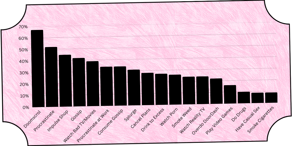 The most common guilty pleasures reported by survey respondents weren’t extreme vices but everyday indulgences: doomscrolling (67%), procrastination (51%), impulse shopping (46%), gossiping (43%), and potential mental coping strategies like bad TV, splurging, canceling plans, or drinking too much (26–38%). In other words, guilt came less from wild escapades than from ordinary behaviors coded as lazy or unserious — the kinds of pleasures that bump up against internalized labels.